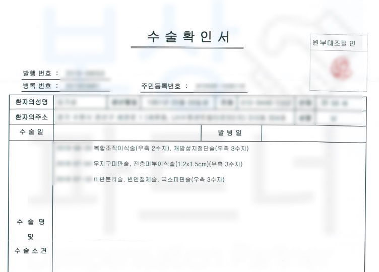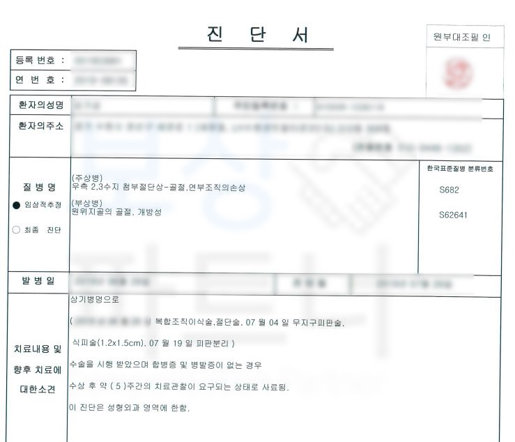 보상파트너에 연락주신 김@@님은 2수지 3수지 원위지골 골절 S62641 S682 진단받아 수술을 받게 되었습니다.