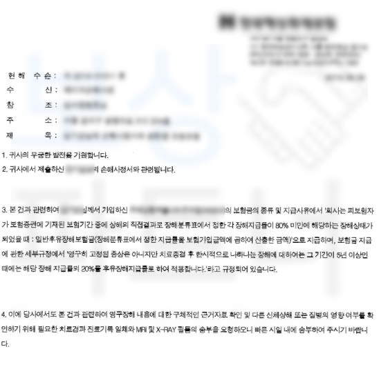해당사건은 굳이 장해진다서 발급 없이 영상CD와 함께 손해사정서 및 증빙자료를 송부하였습니다.