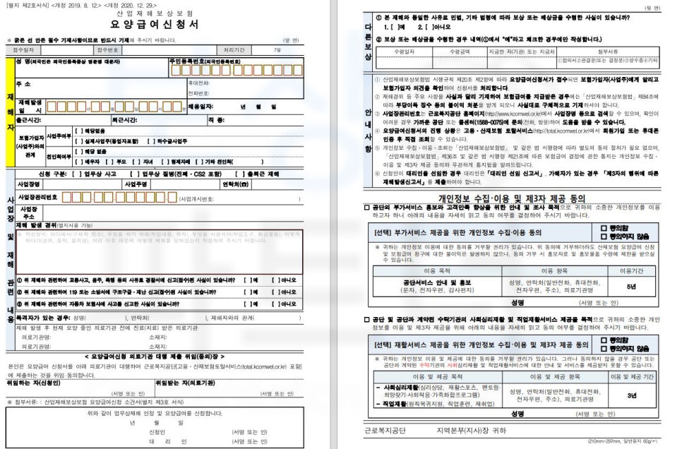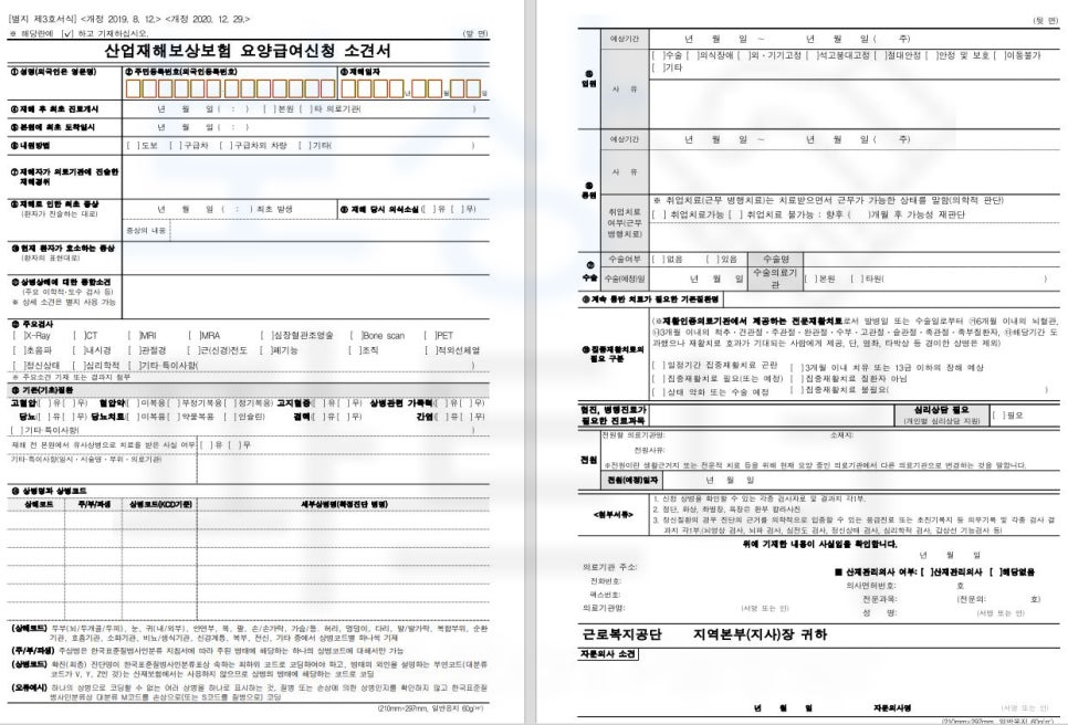 요양신청서와 함께 의료기관의 검사, 진단, 치료 계획 등에 대한 소견서도 함께 제출되어야 하는데요, 치료받은 의료기관에 원무과에 산재처리 말씀하시다면 당연히 작성해주실 겁니다 ^^
