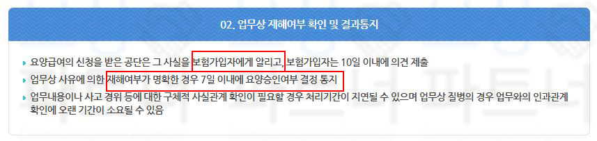 관할 근로복지공단은 사업주에게 사고 사실을 알리고 업무상 재해를 확인한 후 7일 이내 요양승인여부를 결정하여 우편 혹은 문자로 통지합니다. ** 사실관계 확인이 더 필요할 경우 오랜기간이 소요될 수 있다는 점 염두해주세요. **