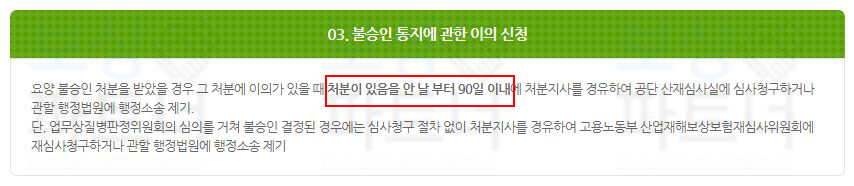 만약 요양 불승인 처분을 받았다면 처분이 있음을 안 날부터** 90일 이내**에 이의 신청을 하셔야 합니다. 이 포스팅을 읽으시면서