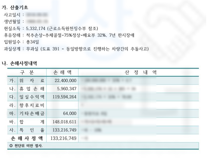 등의 항목으로 구성됩니다. 상황에 따라서는 기타 손배금이나 간병비 등이 포함될 수 있지요.