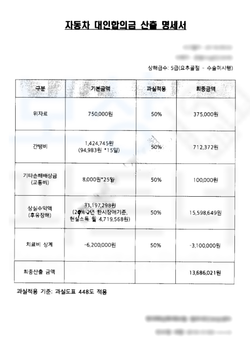의뢰인의 상황에 따라 업무상 유리한 방식을 적용하여 교통사고 합의금 계산을 하게 되는데요, 오늘은** 약관에 따른 지급방식을 설명**해드리며 약관에 따라 산정하는 것과 특인 제도를 활용하여 산정하는 것의 실제 사례를 소개해드리겠습니다.