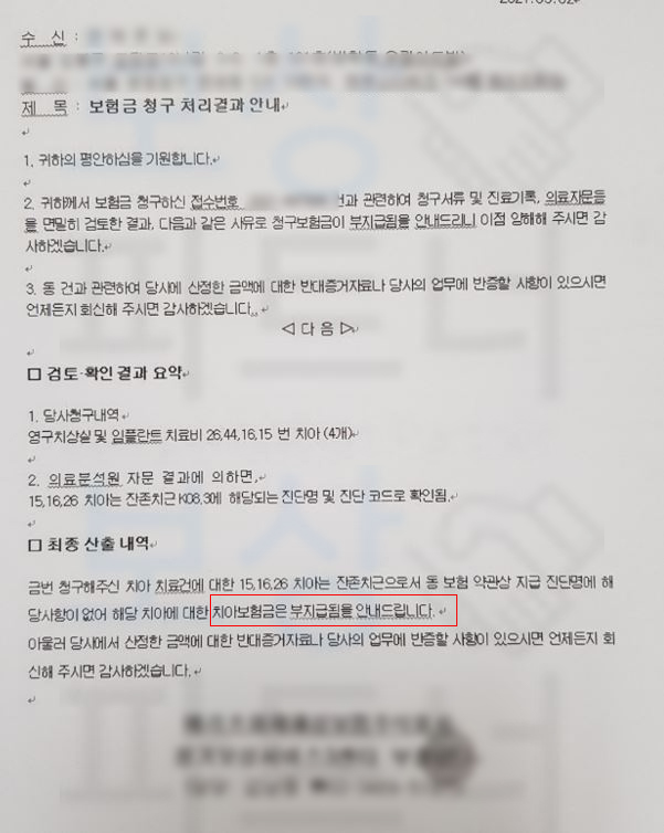 위 내용처럼 4개의 치아를 발치후 임플란트 했지만 청구서류 및 진료기록, 의료자문 결과 무려 3개의 치아가 K08.3 잔존치근에 해당하여 청구한 보험금이 부지급된다는 통보를 받고 연락주셨는데요, 이미 부지급통보를 받고 연락주셨기에 쉽지 않은 사건이었지만 다행히 잘 처리되어 지급받을 수 있었습니다.