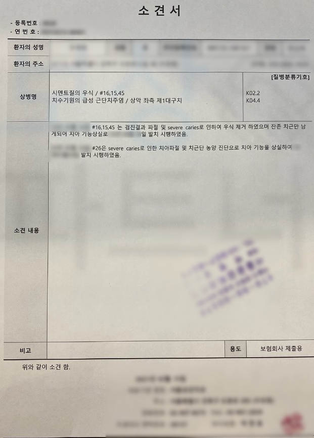 의뢰인의 치아에 대해 K02.2 시멘트질의 우식증 K04.4 치수기원의 급성 근단 치주염 적용이라는 증거를 수집했고 약 2달간의 분쟁이 오간 결과 발치후 임플란트 보험금 인정 받을 수 있었습니다.