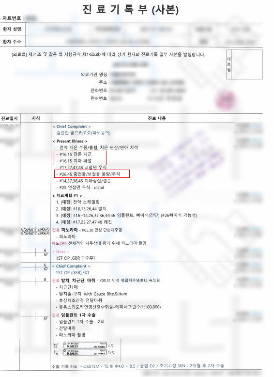 보상파트너는 의뢰인의 진료차트, 치아 파노라마 사진을 받아 분석을 진행하였고 보험금 지급의 가능성을 확인하였습니다. 보상파트너는 의뢰인의 임플란트 보험금 지급의 타당성을 증명하기 위해