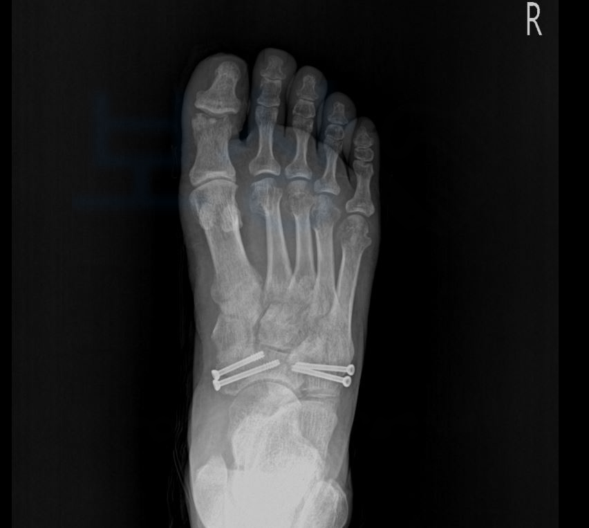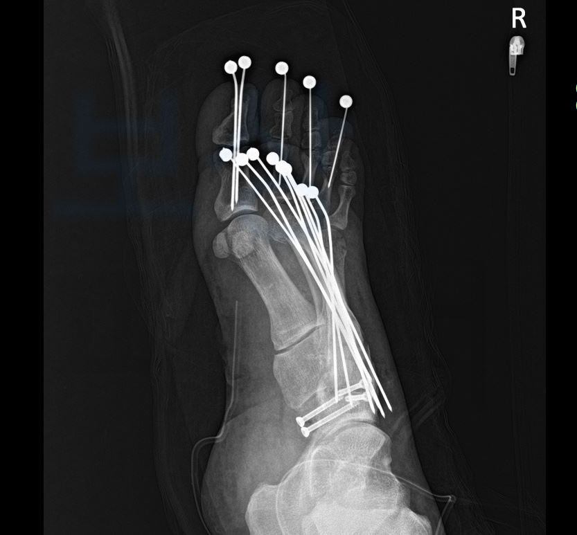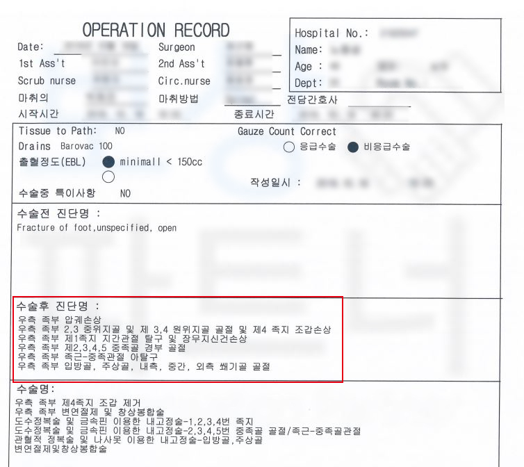 다발성 발가락 압궤손상으로 1 ~ 5번 족지 모두 금속으로 고정하는 수술을 받으셨어야 했습니다.