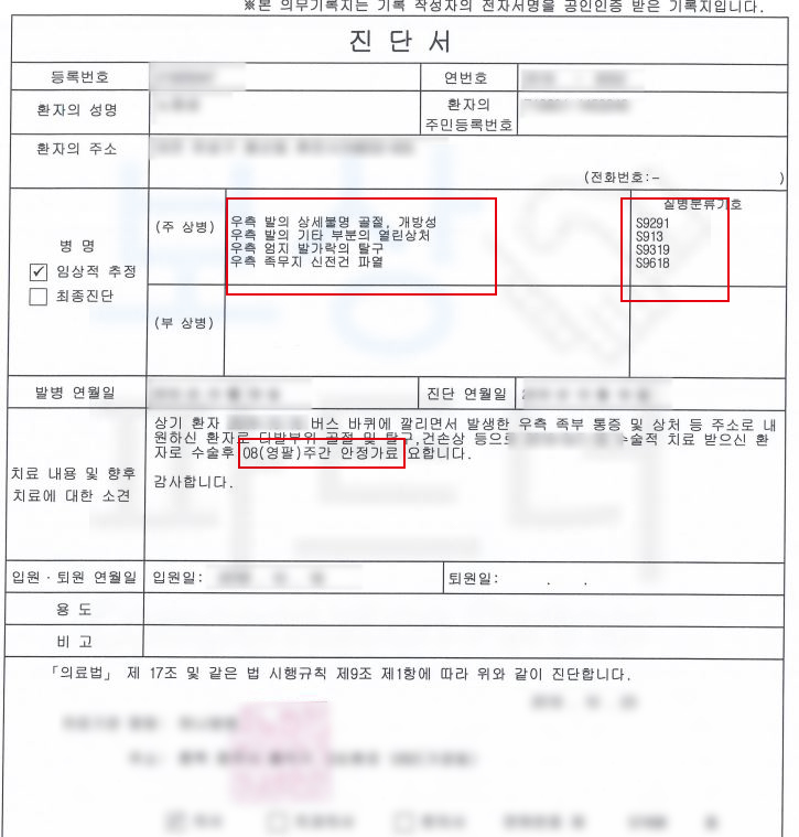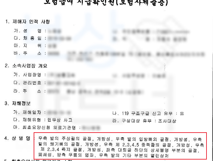 하지만 수술을 받았다고 해서 모두 끝이 아닙니다. 수술 이후 괴사 및 골수염 감염 등의 위험이 있기 때문에 경과 역시도 잘 살펴봐야 하죠. 먼저 산재 사고인 경우 관할 근로복지 공단으로 산재 신청을 하실 수 있습니다.