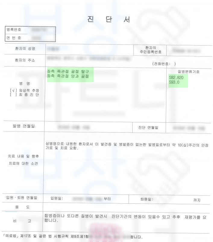 건설현장에서 일하시던 이@@님은 일하던 중 미끄러지며 발목이 돌아갔고 심각한 통증을 호소하셨습니다. 방사선 촬영을 비롯한 정밀검사를 시행한 결과 왼발목의 양쪽 복사뼈의 골절 즉 양과골절 S930 진단되었고