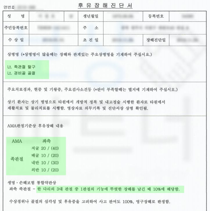 대학병원의 전문의에게 장해평가 받은 결과 의뢰인은 무려** 발목관절 뚜렷한 후유장해 ** 10%에 해당하였습니다. 보상파트너는 진단된 장해평가를 기준으로 손해사정서 및 증빙자료를 준비했는데요, 물론 보험사에서도 조사관을 배정하여 현장조사 및 의료자문을 시행하며 각종 동의를 요구하였지만 불필요한 동의에 대해서는 적절한 대응을 하며 의뢰인의 보험금 산정에 최선을 다한 결과 처음 청구한 지급률 모두 인정받아 발목골절수술 발목관절 후유장해 보험금 2천만원 지급받을 수 있었습니다.