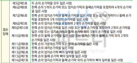 손가락은 엄지손가락과 그외 2~5수지로 나뉩니다. 엄지손가락은 지관절 이상을 잃어야 해당되며 그 밖의 손가락은 1수지관절 이상을 잃은 상태여야 손가락을 잃은 사람에 해당합니다.