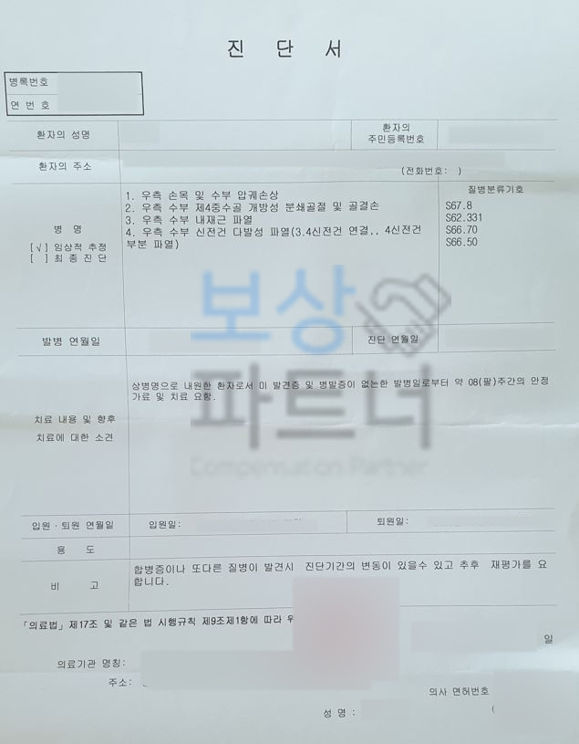 산재 장해등급 판정에 대해 궁금하신 점이 있으시다면 보상파트너의 무료 상담 받아보시길 바랍니다. 감사합니다.