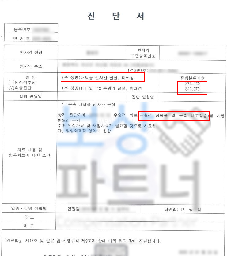 결론부터 말씀드리자면, 황@@님은 보상파트너와 함께하셔서 대퇴부 골절과 허리 골절 모두 인정되어 산재 장해등급 제11급 조정되었고