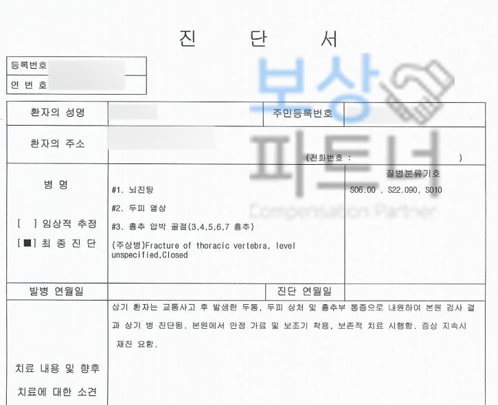 안녕하세요. 보상파트너입니다. 실제 문의들어온 사례 중 일산 거주하시는 심@@님은 교통사고를 당하게 되었는데요, 흉추압박골절 척추 장해 기준 T3번 T4번 T5번 T6번 T7번 금간 허리