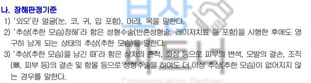 상처의 흔적, 화상 등으로 피부의 변색, 모발의 결손, 조직(뼈, 피부)의 결손 및 함몰 등으로 성형수술 하여도 더 이상 추상(추한 모습)이 없어지지 않는 경우