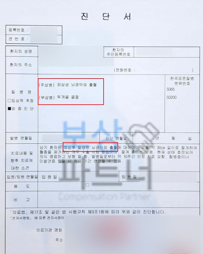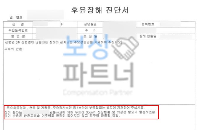 저희 보상파트너로 연락주신 김@@님 께서도 택시에 머리를 부딪히는 상해 사고로 인해 개두술을 시행하여 혈종을 제거하는 수술을 받았는데요, 문제는 두피의 수술을 받으시고 해당 부위에 머리카락이 자라지 않는 후유증을 호소하셨습니다.