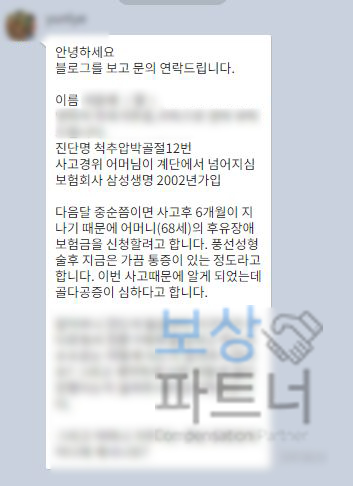 안녕하세요 보상파트너 손해사정팀입니다. 저희 카톡으로 아래와 같은 문의가 왔더군요.