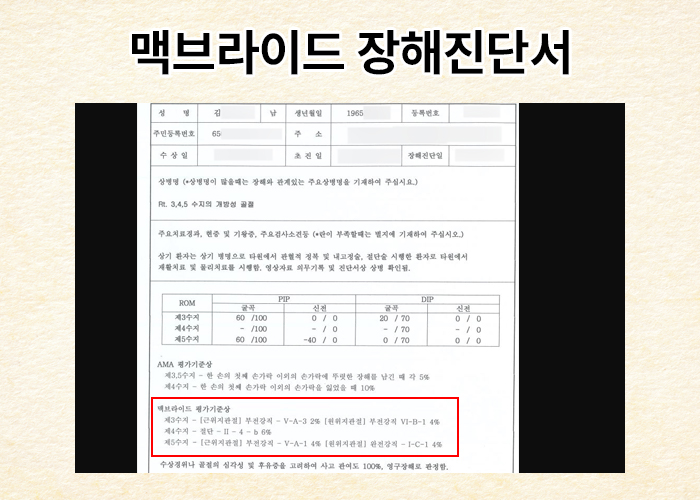 즉 맥브라이드 장해평가 방법에 따라 공신력있는 대학병원의 전문의로부터 후유장해 진단서 받았습니다.