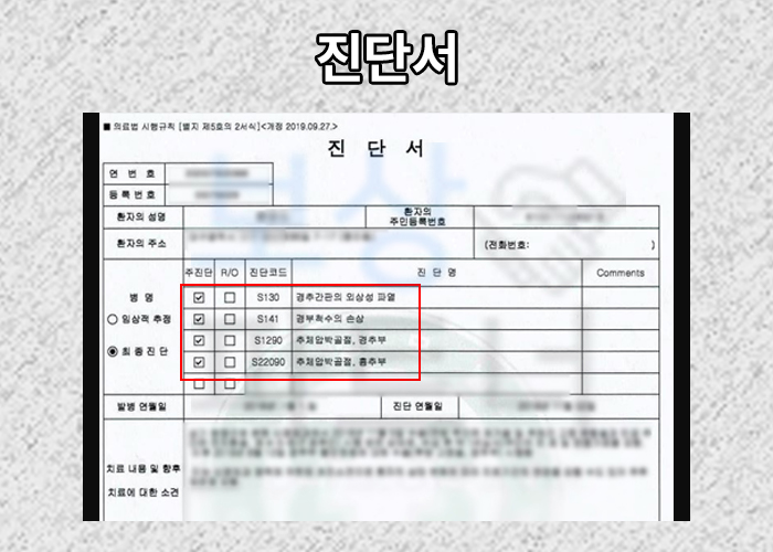 위 진단서를 보시면 윤@@님은 **경추골절 S1290 **진단받아 경추 전후방고정술을 받을 수 밖에 없었습니다.