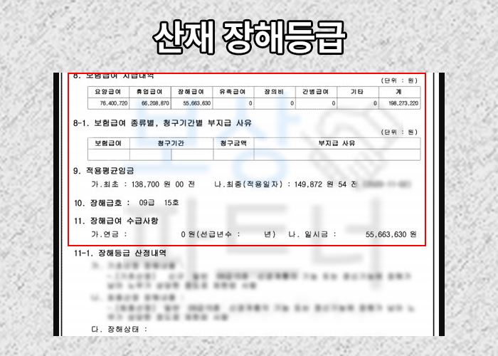 위와 같은 검사를 요청하고 올바른 장해 평가를 위해 도움을 드린 결과 윤@@님은 산재 장해등급 9급 15호 인정받아 장해급여 55,663,630원 지급받으실 수 있었습니다.