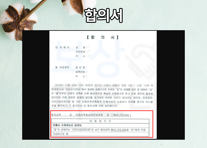 이@@님은 근재보험 합의금으로 22,723,000원 즉 약 2천 2백만 원 가량 보상받을 수 있었습니다.