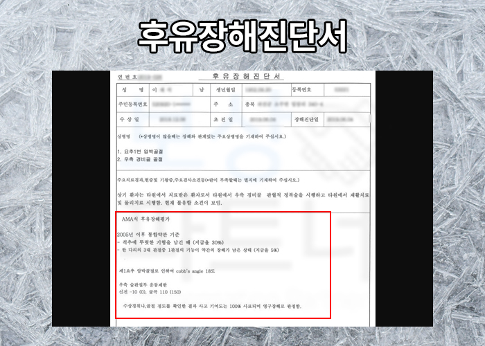 의뢰인은 05년 약관 이후로 적용하여 척추의 뚜렷한 기형 30% 또한 슬관절 약간의 장해까지 5% 총 35% 장해 지급률로 평가받았습니다. 장해를 평가 받아 진단서 제출한다고 보험금 청구가 끝난 것이 아닙니다.