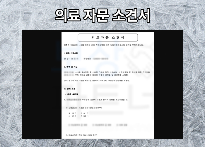 개인적으로 가입해둔 보험에서 장해 보상을 위해 미리 서류를 준비하기 시작하였습니다. 주치의가 아닌 공신력있는 제 3병원의 전문의로부터 AMA방식의 후유장해 평가 받게 되었고