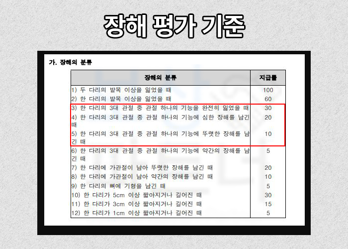 3대 관절 (고관절, 슬관절, 족관절) 중 관절 하나의 기능을 완전히, 심한, 뚜렷한, 약간 장해를 남긴 경우 각 5% ~ 30% 지급률로 보험금을 지급해주고 있죠. 누구나 보험 약관을 펼쳐서 위 내용을 확인해보실 수 있습니다.
