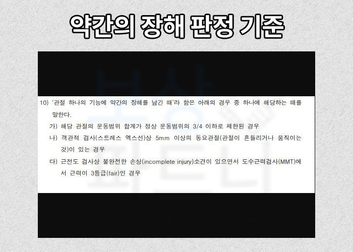 약간의 장해 판정 기준을 먼저 보면 복사뼈 골절로 수술한 경우 적절한 치료를 했음에도 발목 관절의 정상 운동범위(ROM)이 3/4 이하로 제한되어야 합니다. 또한 발목이 흔들거리는 동요관절이 스트레스 검사상 5mm 이상 확인되거나 근전도검사상, 근력이 손상되었음이 확인되어야 하죠.