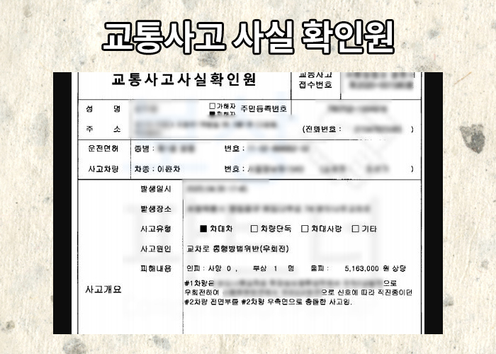 사고 이후 경찰에 사고 접수를 하셨고 오토바이 즉 이륜차도 차량으로 분류되어 사고유형은 차대차사고로 구별되었고 의뢰인은 정상신호에 주행 중 이었기에