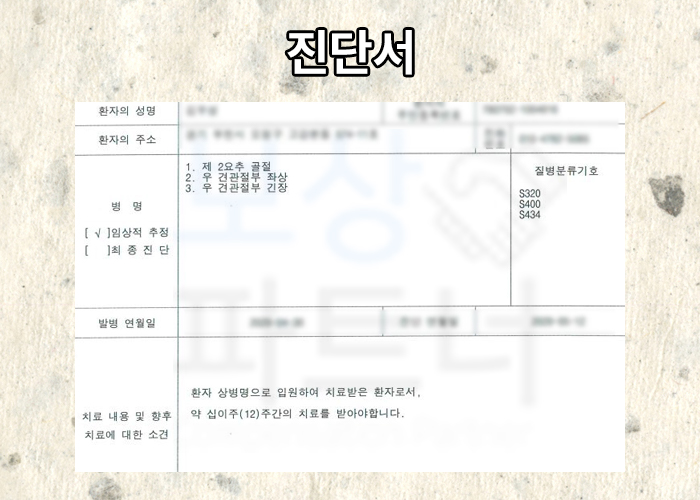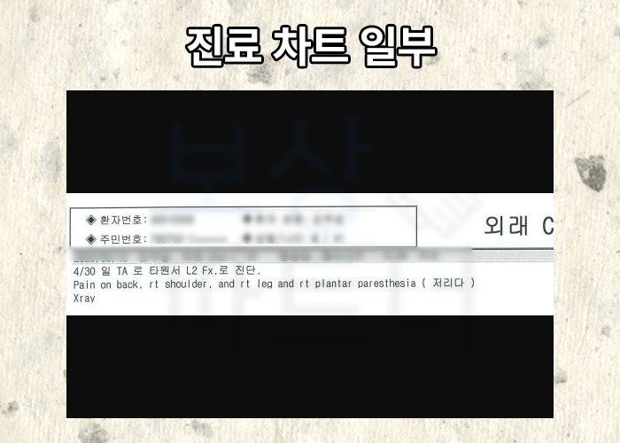 의뢰인은 사고로 인해 요추2번 골절 진단받으셨고 TLSO 흉요천추 보조기 착용하시며 침상안정을 요하였습니다. 무려 12주간 즉 3개월간의 안정을 취하셔야 했죠.