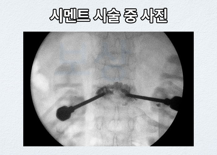 골절된 척추체에 의료용 골시멘트를 주입, 주사하는 시술입니다. 일반적으로** 1 - 2주 보존치료를 했으나 골밀도가 좋지 않거나 골다공증이 있는 환자분들**이 척추체 강화술을 받습니다.