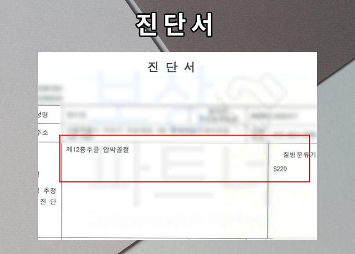의뢰인께서 블로그를 보고 연락주셔서 하신 첫 말씀입니다. 스키장 넘어짐 사고를 당해 흉추 12번 압박골절 진단받은 상황이었죠. 질병 분류기호 S220 이라고 쓰여있는데요, S22090, S22070 등 으로도 쓰여 있을 수 있습니다.