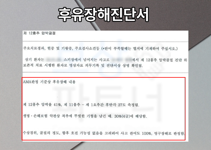 바로 후유장해 보험금 청구입니다. 오늘은 스키장 넘어짐 사고로 흉추 압박골절 진단받은 의뢰인의 보상 실제사례를 소개해드리겠습니다. 후유장해 보험금 그냥 청구하려던 분들! 오늘의 포스팅 꼭 읽어주시길 바랍니다.