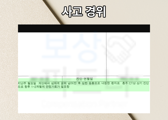 보상파트너 손해사정팀은 **영상CD, 진단서, 의무기록, 보험증권 등을 받아 면밀한 분석을 도와드렸습니다. **의뢰인읜 사고 경위에 대해서도 추가적으로 손해배상을 청구할 여지가 있는지 알아보았죠. 한 사건 한 사건, 내 가족이 다친 것 처럼 정성껏 진행했습니다.