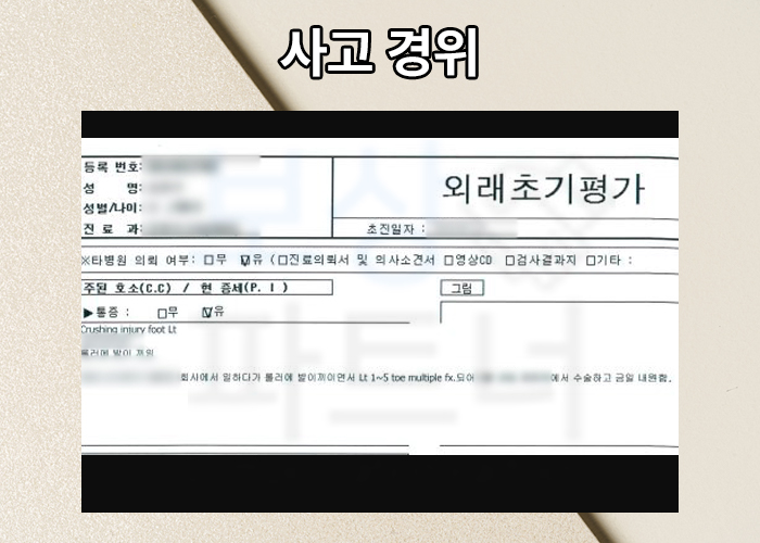 안녕하세요. 보상파트너 독립 손해사정팀입니다. 이번 시간에는 발가락 골절로 보상파트너에 문의주신 의뢰인의 사례를 소개해드리며, 각자의 보상을 점검해보는 시간을 갖도록 하겠습니다.