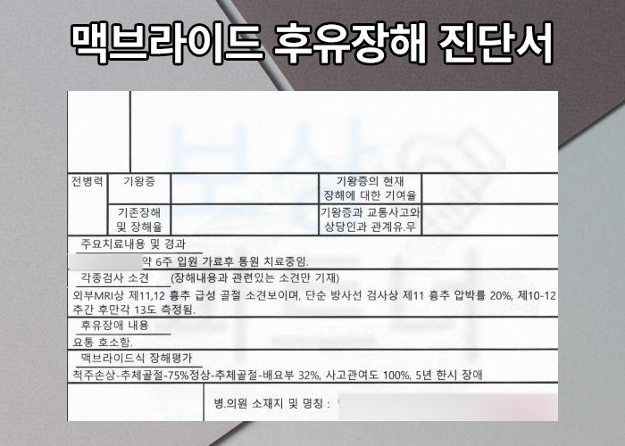 맥브라이드 장해 평가 방법을 준용하여 척추 압박골절 장해 평가를 받아야 하는데요, 그 장해 평가 방법의 약간의 차이로도 합의금 산정에 큰 영향을 주니 올바른 장해 평가를 받으셔야겠죠.