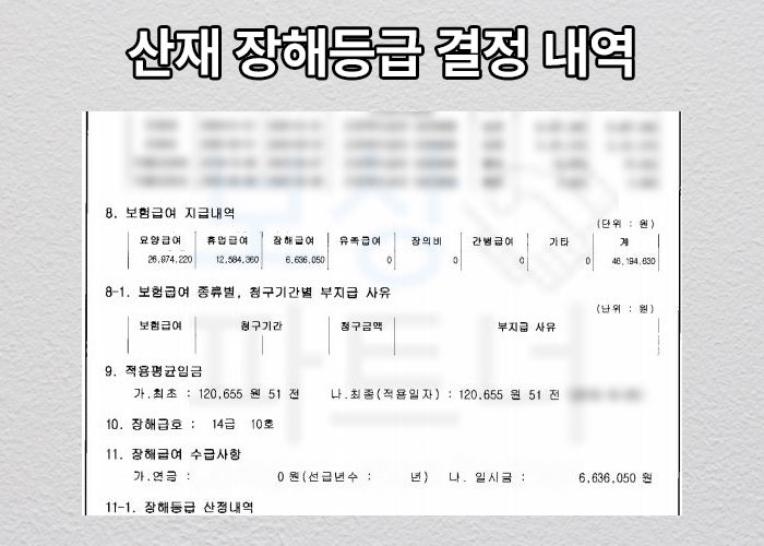 휴업급여는 12,584,350원, 장해급여는 6,636,050원 지급받을 수 있었습니다. 발목의 움직임은 다행히 장해가 남지 않으셨지만 약간의 통증에 대한 장해가 인정되어 14급 10호 인정받으신거죠.