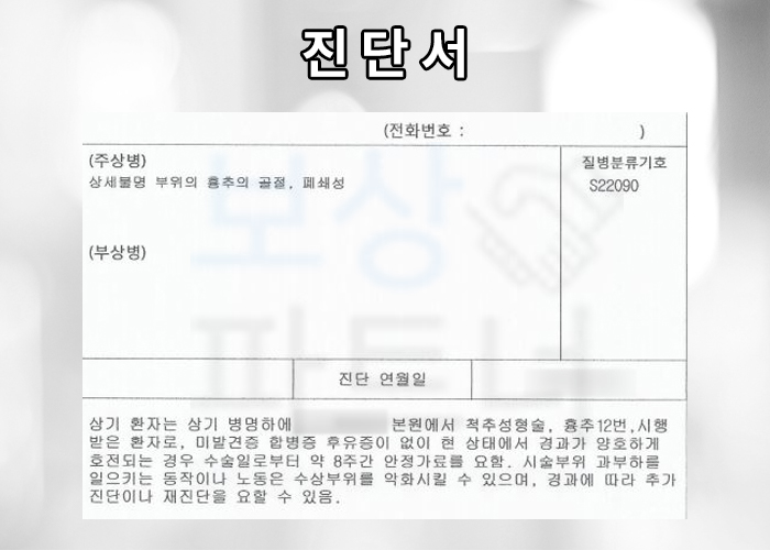특히 등뼈 흉추 12번 부위는 요추 1번과 연결되어 있어 각도가 변형되는 경계면에 위치해있습니다. 즉 사고로 인해 골절이 발생하기 쉬운 위치에 있는거죠. 오늘 소개해드릴 사례 역시 흉추 12번 골절로 TLSO 흉요천추 보조기를 착용하며 안정을 취하셔야 했던 의뢰인입니다. 위와 같은 상황에 내 보험에서 얼마나, 어떻게 보상받을 수 있을지 소개해드리겠습니다.