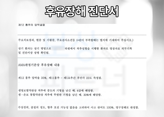 흔히 우리가 생각하는 장해란 손가락이 절단되거나, 거동이 불편하거나 등등의 신체의 훼손, 절단, 마비 등의 증상을 생각합니다. 하지만 흉추압박골절의 경우 보험 약관에 따라 척추체의 압박률이나 각도의 변형에 따라** "보험 약관 상 장해로 볼 수 있습니다."**