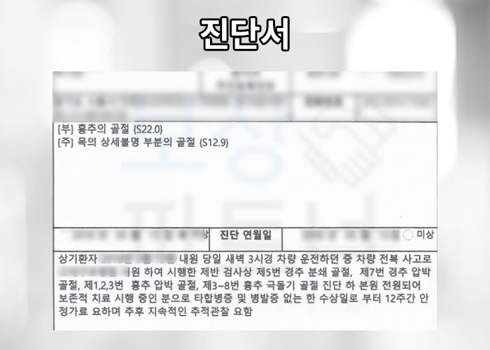 경기 거주하시고 계신 의뢰인은 새벽에 운전을 하시던 중 차량이 전복되는 사고를 당하게 되었습니다. 바로 응급실로 내원하게 되었는데요.. 그렇게 도착한 병원에서 엑스레이와 mr 검사를 받고 진단받은 병명은...