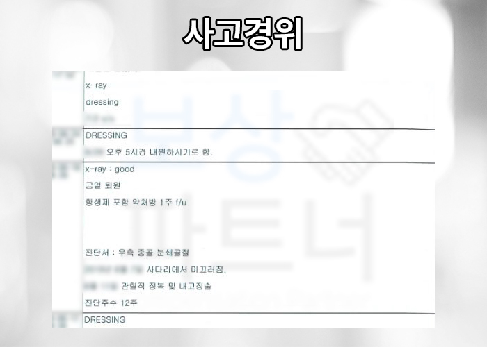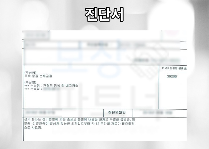 종골 분쇄골절 S9200 진단받게 되어 수술적 치료가 불가피했습니다. 무려 전치 12주 진단받아 최소 3개월간의 요양이 필요하신 상황이었죠.