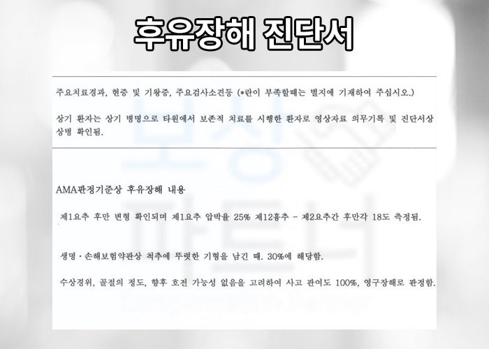 저희는 의뢰인의 장해를 올바르고 객관적으로 평가 받기 위해 공신력있는 제3병원의 전문의로부터 후유장해 평가를 받도록 도움을 드렸습니다. 의뢰인은 요추1번 압박골절 척추의 뚜렷한 기형 장해 30% 해당하였습니다.