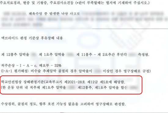 이렇듯 장해급여 청구의 복잡한 과정 때문에 반드시 손해사정사를 선임하여 청구를 진행하시는 것을 추천드립니다. 의뢰인의 경우 자녀분이 학교 체육수업 중 넘어져 척추뼈 골절된 사례입니다.