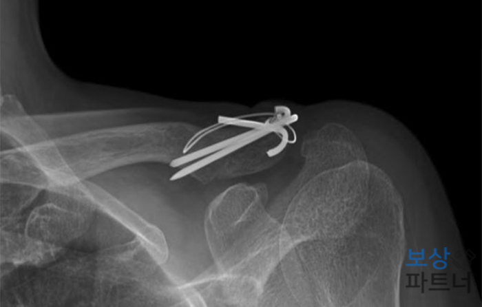 이 사고로 쇄골이 골절되셨고, 또한 두개골이 골절되어 경막외출혈 증상까지 있으셨는데요. 쇄골 쪽에는 안정적인 골유합을 위하여 금속핀 삽입하여 고정수술 받으시게 되었습니다.