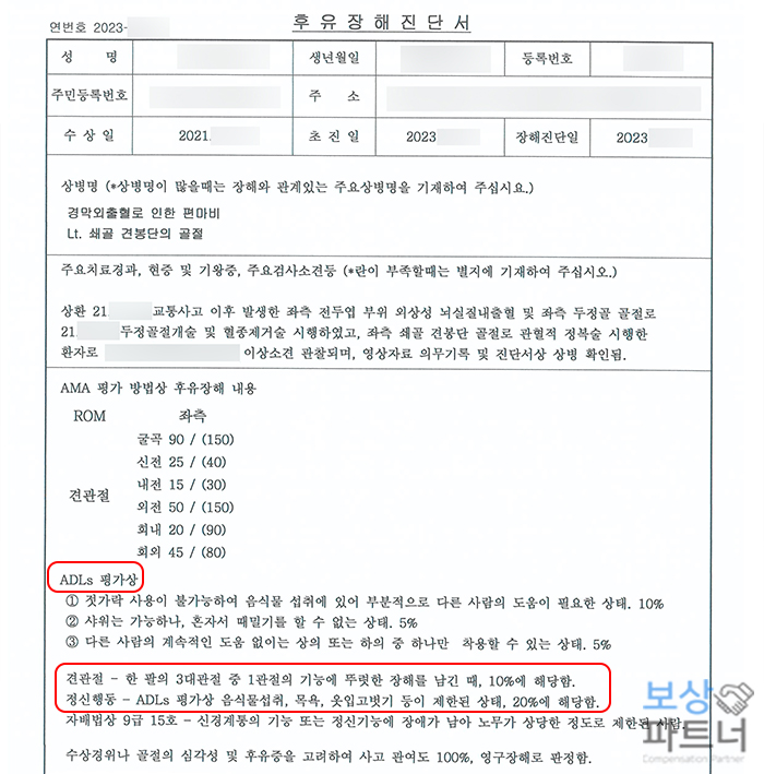 다만 후유장해 보험금은 지급심사가 매우 까다로운데요. 의뢰인처럼 편마비 증상의 경우, 일상생활 기본동작(ADLS)제한 장해 평가표를 기준으로 하여 후유장해 진단서를 제대로 발급받는 것이 중요합니다.