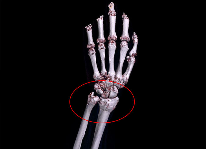 진단명은 좌측 요척골 원위부(손목 부위) 골절이었는데요. 영상 사진을 보시면 손목 뼈 부위에 금이 가 있는 것을 확인하실 수 있습니다. 손목 뼈는 수시로 움직이는 중요한 관절에 연결되어 있습니다. 그래서 조금만 잘못 붙더라도 지속적인 통증이나 관절염 증상이 나타날 수 있습니다.