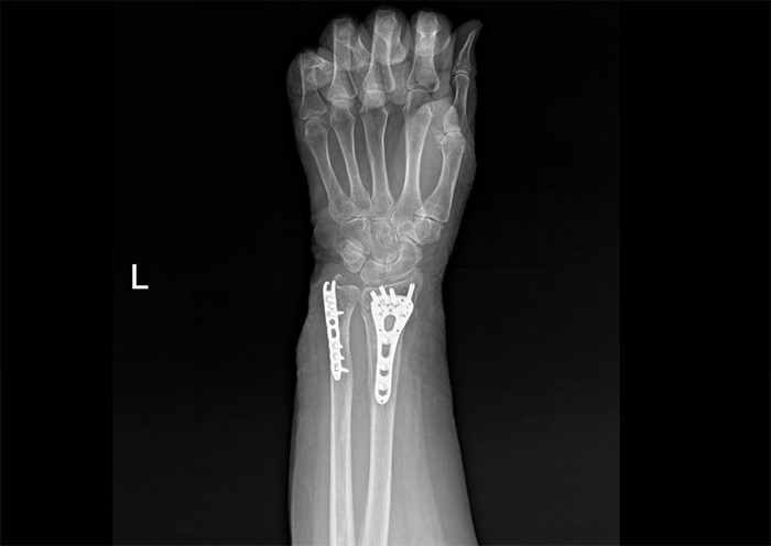 그러므로 세밀하고 안정적인 골유합이 필수적인데요. 관혈적 정복술을 시행하여 금속판과 못을 삽입하여 골절된 뼈를 단단하게 고정하는 수술을 시행하였습니다.