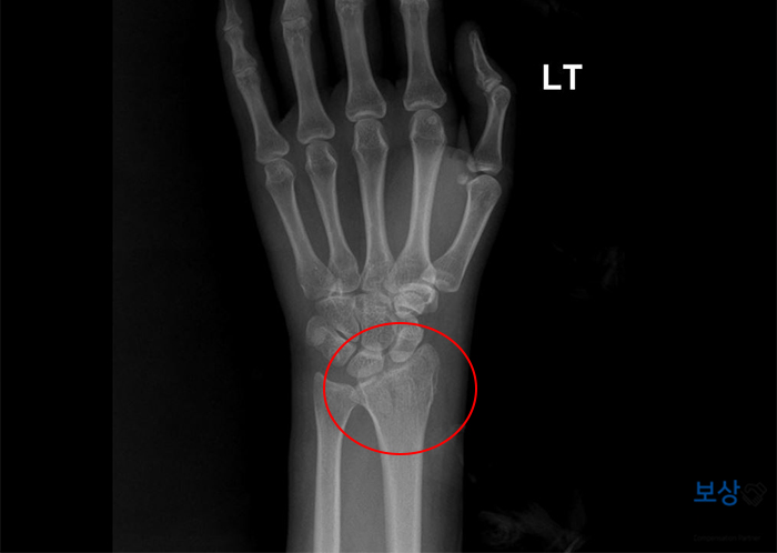 [주] 좌측 요골 하단의 상세불명 골절 (S52.59) [부] 좌측 손목 및 수근골 인대의 외상성 파열 의증 (S63.3) 이 사고로 환자분은 손목 부분의 뼈(요골, 수근골) 골절되셨는데요. 위 사진에는 잘 보이지 않지만 두꺼운 요골 뼈 안쪽으로 골절 면이 생기게 되었습니다.