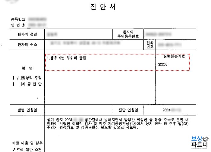 안녕하세요! 손해사정 전문 **《보상파트너》 **입니다. 본격적인 장마가 시작되어 하늘에서 비가 하루 종일 쏟아지고 있습니다. 이럴 때일수록 미끄럼 사고를 조심하셔야 합니다. 특히 맨홀이나 대리석 등에서 빗물에 미끄러져 낙상사고가 자주 발생하는데요. 만약 뼈가 약하신 중년 이상의 여성분이나 어르신이라면 충격으로 인해 척추골절(흉추, 요추)로 이어질 수도 있습니다.